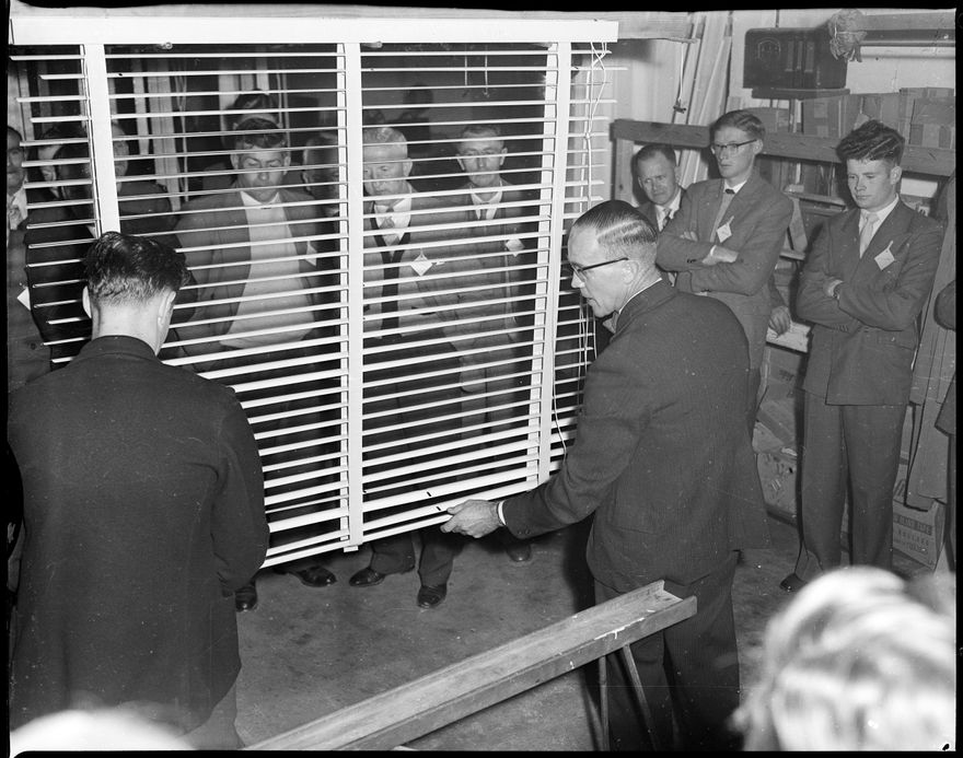 This image was not published in The Manawatu Evening Standard, taken on 11 July, 1959. "Demonstration of the Luxaflex blinds."