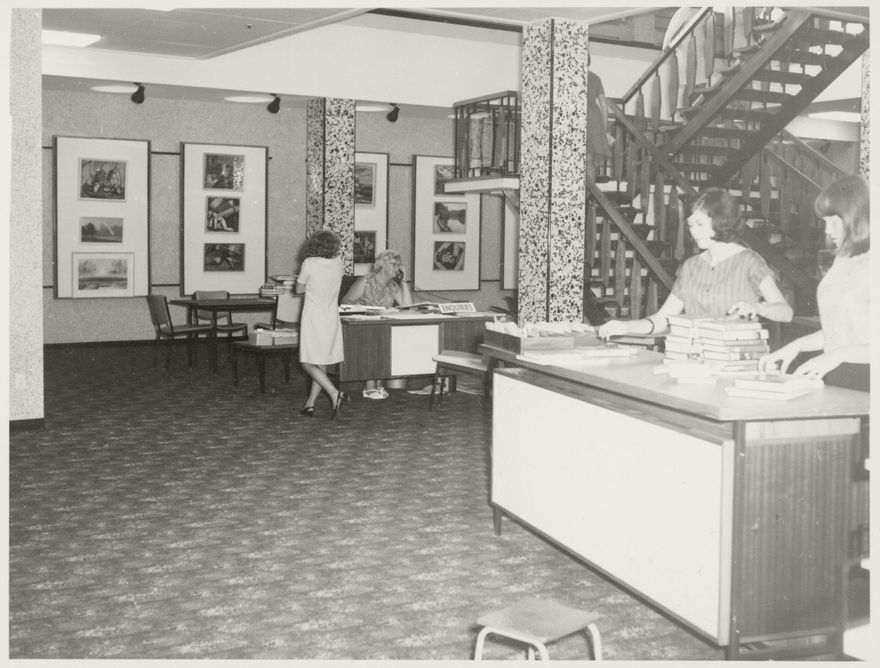 - A series of images showing the interior of the newly constructed public library. Includes customers and staff.