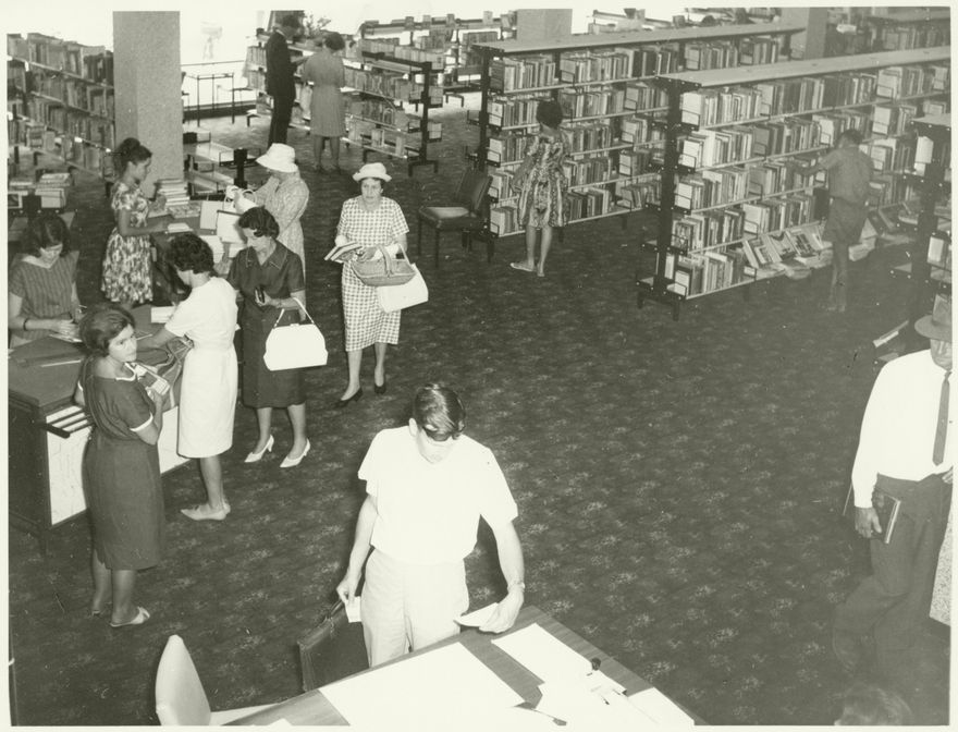 A series of images showing the interior of the newly constructed public library. Includes customers and staff.