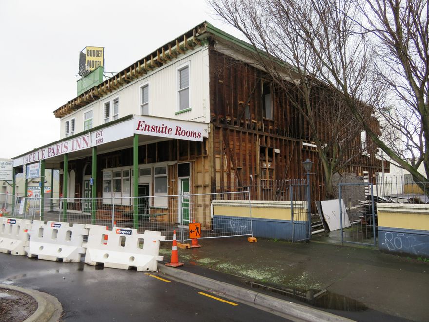 Demolition of the Cafe De Paris Inn looking west along Main Street. The exterior facade has been removed and builders have already gutted the inside of the building.