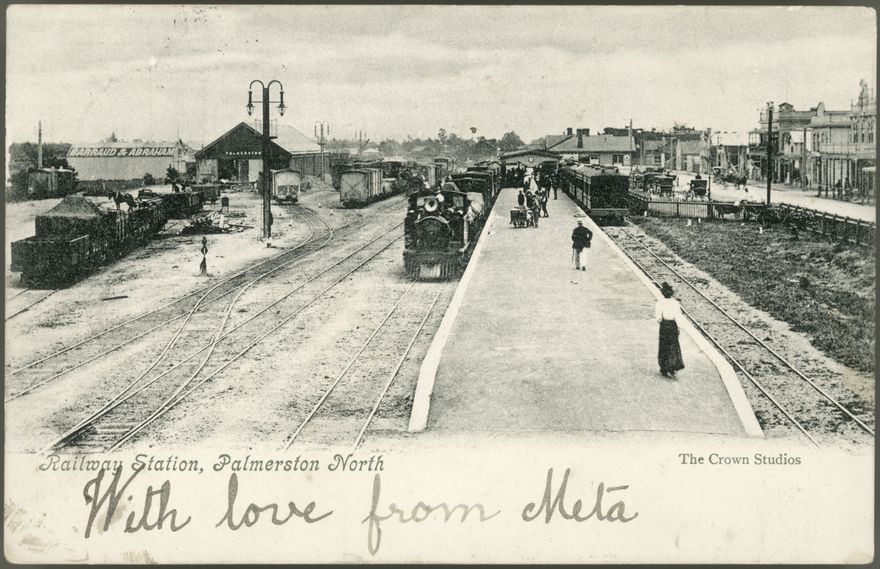 The Railway Station moved from the centre of The Square to Main Street in 1890. This postcard reads, "With love from Meta".