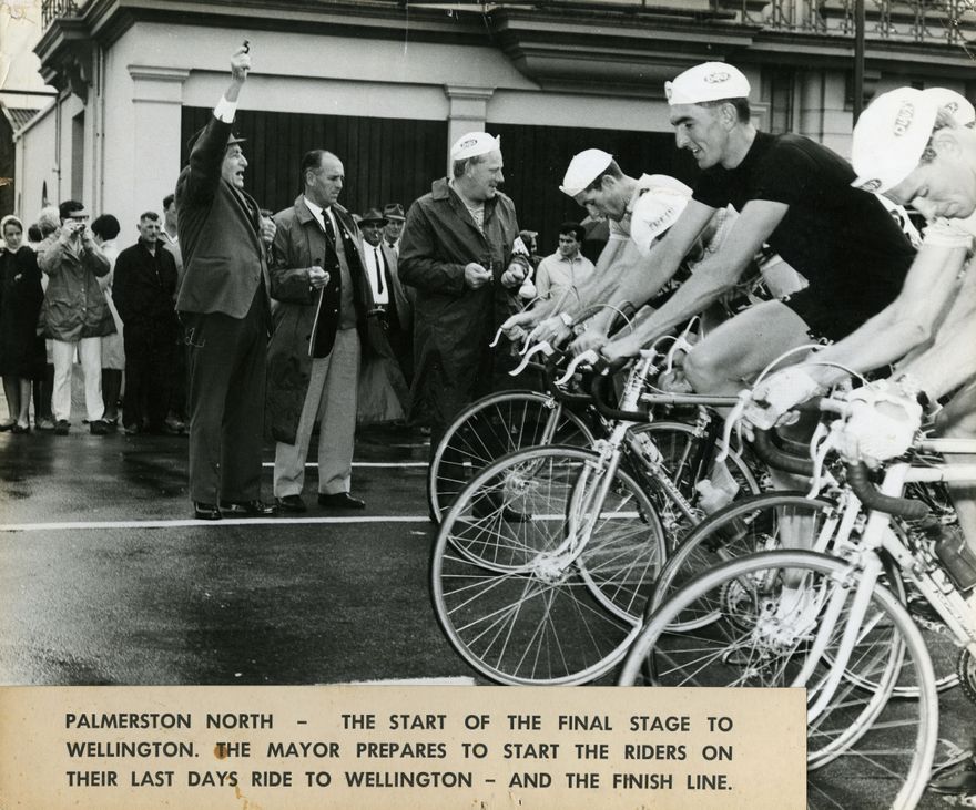 Competitors in the Dulux 6 Day Cycle Race begin the Palmerston North to Wellington component at the starting line in front of the Grand Hotel. Mayor Gilbert Rennie is shown with the starting gun. The rider in black is Tony Ineson, of Southland.