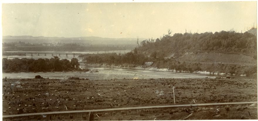 This postcard is thought to be a view of the original wooden Fitzherbert Bridge, which was built in 1877. It would be taken from a an area upstream, looking across to Fitzherbert and the Tararua Ranges