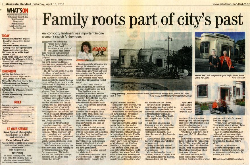 Journalist Tina White's weekly "Memory Lane" article in the Manawatū Standard. Carol Davidson (née Jefferies) was adopted when she was a baby. Around 1995, Carol started making contact with her birth family. A 1939 picture of people sitting outside Ladies' Rest in Te Marae o Hine/The Square gave Carol Davidson the first glimpse of her birth mother Marion Emerson and aunts. In 2010, Mrs Davidson had another photo taken at the same spot with her aunts and granddaughter.