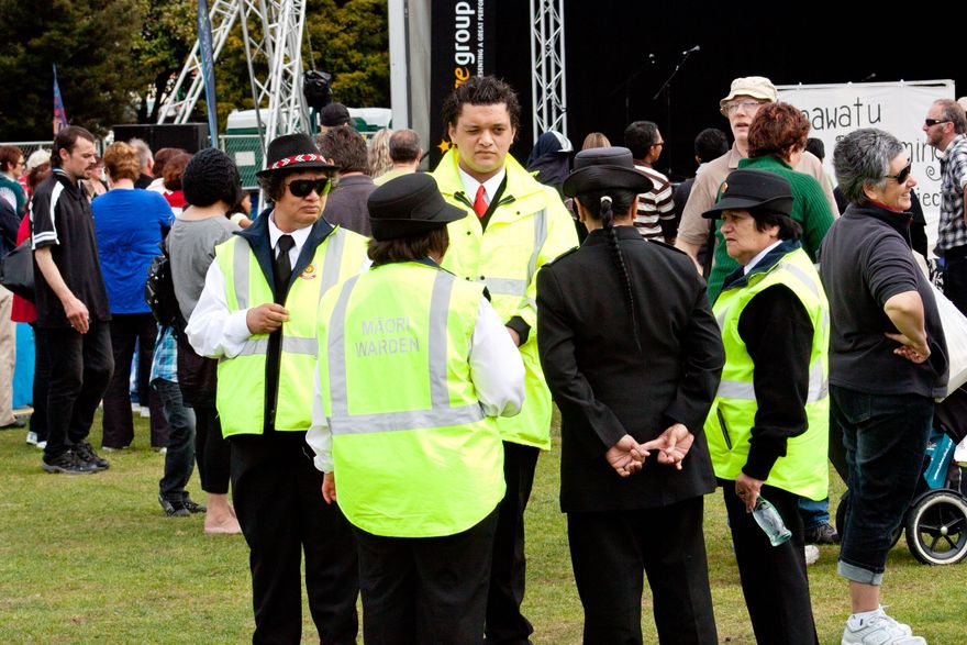 Māori Wardens on duty - Rugby World Cup fans were able to enjoy a wealth of events in Te Marae o Hine – the Square during the 2011 Rugby World Cup, including the 'Our People, Our Place Cultural (OPOP) Food and Music Fest' in the lead up to the game between Argentina and Georgia at 1pm on Sunday 2nd October 2011.