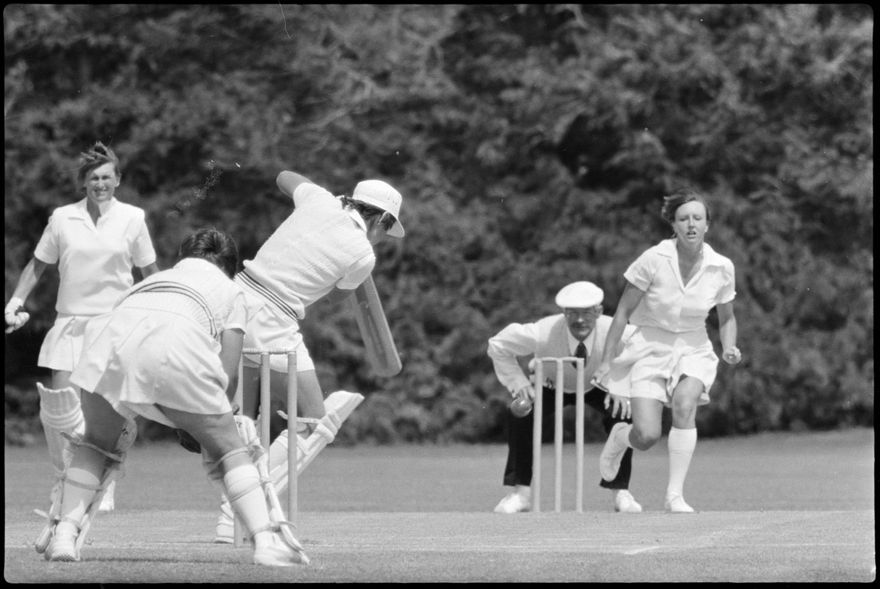 This image was taken (but not used) by the Evening Standard on 21st of January 1982. It depicts the New Zealand women’s cricket team taking on the International XI women’s team in a limited over match for the Hansell's Vita Fresh Women's World Cup 1981/1982. The match was held at Fitzherbert Park in Palmerston North. The New Zealand team won by 97 runs.