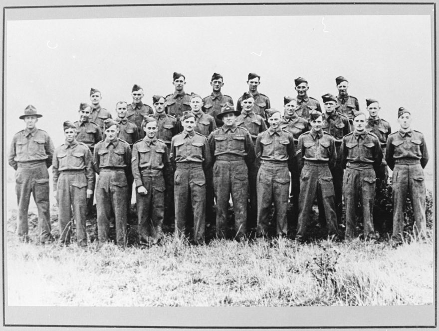 Back row: Peter Field, Joe Meyrick, Tom Dickins, Bert Kendrick, George Blenkiron, Tony Pedersen, 'Ween' Lancaster. Middle row: Captain Stewart (instructor), Ernie Brungar, Lester Field, Jack Brill, Dick Tate, Norman Chowen, Walter Gosling, Leslie Phelan, Les Hastings. Front row: Jack Atkinson, Ronnie Brill, Allan Hopcroft, Jack Robertson, Captain Alex Ferguson, Dick Harrison, Arthur Brill, Bert Mackie, Arthur Crowe. Refer Fitzherbert East Aokautere School and District 1889-1989, p 79.