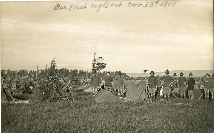 The front of this postcard shows a group of recruits erecting tents and attempting to camouflage them with vegetation. It was written by Henry Ward, who served with the New Zealand Medical Corps, No. 3 Field Ambulance, from March 1917 to March 1919. The message reads: "Our first night out at Palmerston North Nov 13th 1917