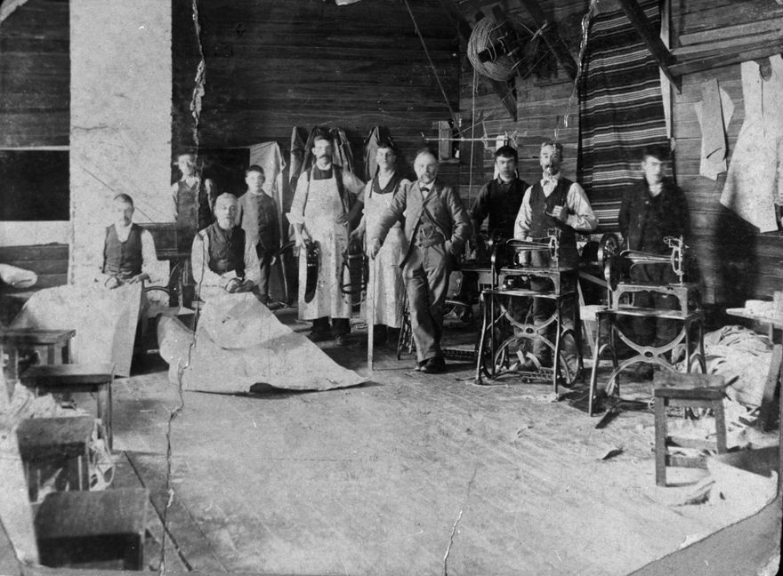 Charles Dahl's factory, manufacturing ropes, tents, horse covers, tarpaulins, oilskin clothing and shirts, was situated in Main Street east, between The Square and Princess Street, on part Section 15. Charles Dahl (4th from right) set up a tent making business in 1885. He later sold his business to the Manawatu Canvas Company.