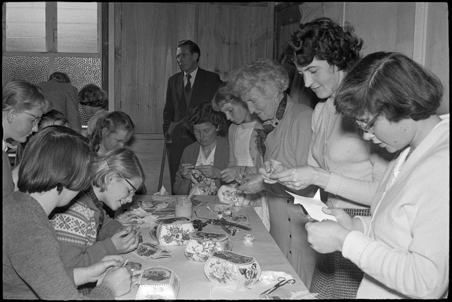 Caption: “Mesdammes E. Simenauer, R. Kent, and A. J. Abbis demonstrate the making of trinket boxes.”