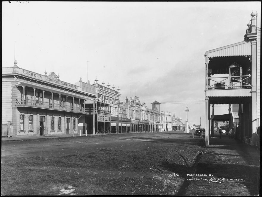 Shown here is The Square looking south-west towards Fitzherbert Street from the corner of Church Street East. This photograph is one of many purchased from the Muir and Moodie Collection held at the Dominion Museum in Wellington. Note the bird cages in the verandah of the shop on the right side of the photograph.