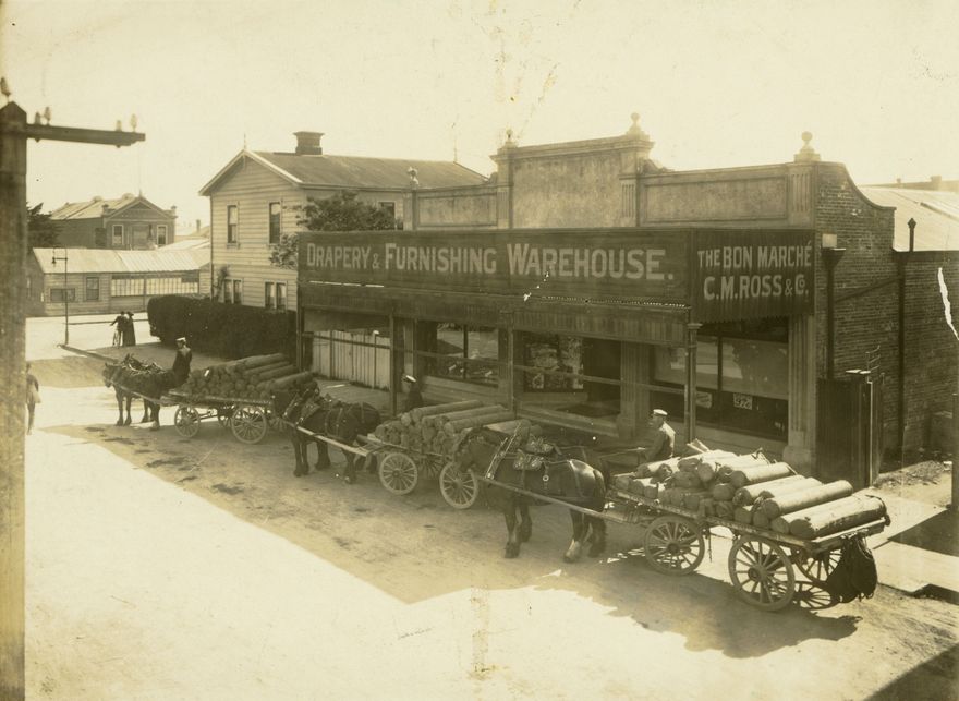 C M Ross established his 'Bon Marche' store on the Square in 1883. By this period the business extended through to George Street, although it is unknown if the buildings connected. the building to the left, on the corner of Coleman Place was a boarding house. In the background can be seen the two storey Fire Station in Cuba Street.