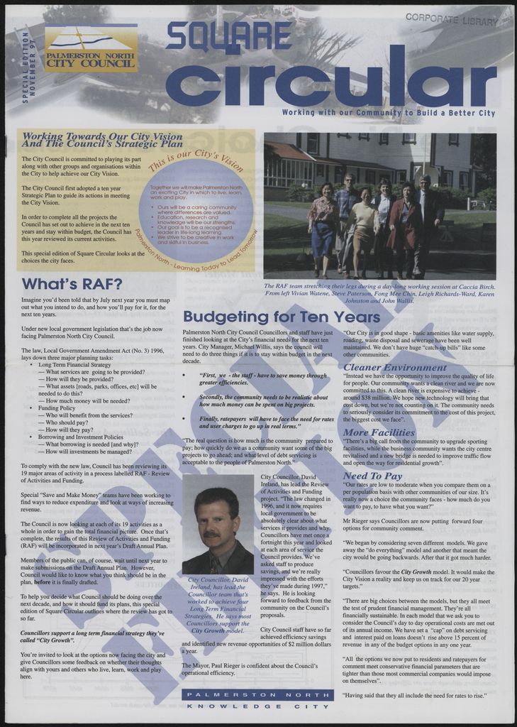 The Square Circular was Palmerston North City Council's monthly community publication, informing Palmerstonians of PNCC initiatives, activites, and events. This month's issue includes: Activities and funding review (RAF); city vision; strategic plan; events; Christmas and New Year hours.