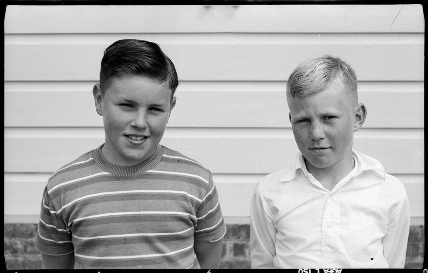 [Photograph of Duxes of City and District Schools: G. Wilby and G. Nairn standing outside their school (unknown)."