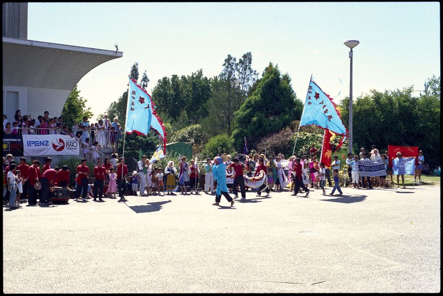 Images from the re-dedication of Te Marae o Hine on Saturday, 3 March, 1990. The following notes were written by City Archivist, Ian Matheson, around the time of the re-dedication. Background: Te Marae o Hine is that part of The Square on which stands the statue of Te Peeti Te Awe Awe and the City Council building. The name, The Courtyard of the Daughter of Peace was offered to Te Peeti Te Awe Awe one hundred and eleven years ago by Matene Te Whiwhi, Paramount Chief of Ngati Raukawa in memory of his ancestress, Rongorito, a famous peacemaker who lived in Waikato thirteen generations ago. Te Peeti Te Awe Awe received the name and offered it to the first Mayor of Palmerston North, George Snelson in the hope that there would be peace between all citizens of Palmerston North. 1990: The City of Palmerston North has commissioned a set of 9 great carvings to be placed in that part of The Square called Te Marae o Hine to form a gathering place for all people. The people of Rangitāne, tangata whenua of this area have imbued these taonga with their mana. They stand as a memorial to Rongorito and a tribute to the vision of Te Peeti Te Awe Awe, Matene Te Whiwhi and George Snelson.