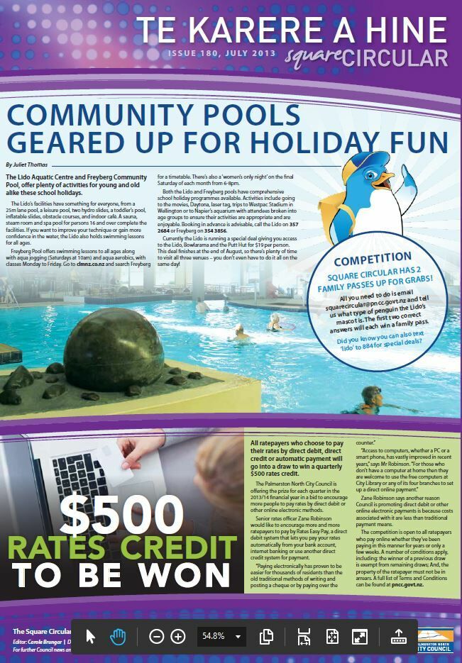 The Square Circular was Palmerston North City Council's monthly community publication, informing Palmerstonians of PNCC initiatives, activites, and events. This month's issue includes: Lido Aquatic Centre; Freyberg Community Pool; rates; Genesis Energy; Victoria Esplanade; Speed Limits; Bylaws; Elections; Creative Communities; Te Manawa; water; civil defence.
