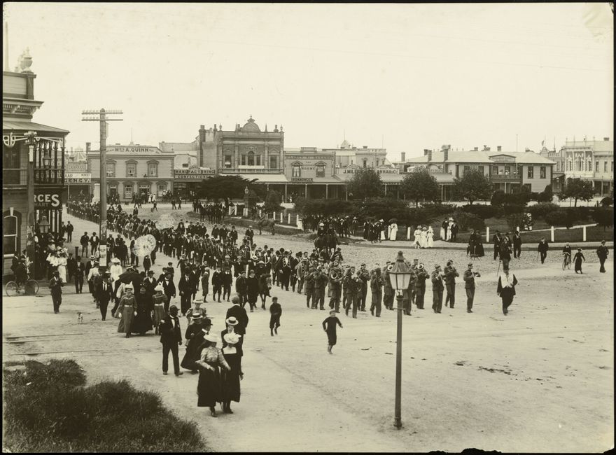 Led by a band, members of the Friendly Society march across the railway lines at the Main Street corner of The Square. They are accompanied by familes and supporters. The Friendly Society men can be seen parading through The Square, crossing the railway line of the corner of Main Street East, led by a brass band. Beyond, to the right, can be seen the corner of Rangitikei Street.