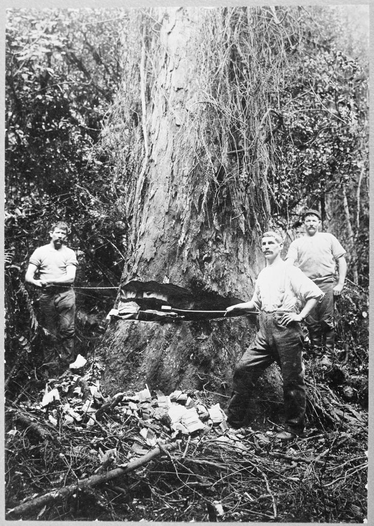 This picture shows the "scarf" being cut in the trunk of the tree by an axeman, while the two men at the rear operate a cross-cut saw. The donor stated that these men (all unidentified) were employed at Climo and Eggers' Sawmill at Waituna West. The sawmill was owned by Jim Climo, with another Climo perhaps, and Charlie Eggers. It was situated on Steven Williamson's property on the terrace south of the Waituna Stream, a few hundred yards west of No 377 Main Road and south of the road junction at the settlement of Waituna West. The mill operated for about 2.5 years and cut out a large patch of bush on Williamson's property. Charlie Eggers then went to Raurimu and milled there.