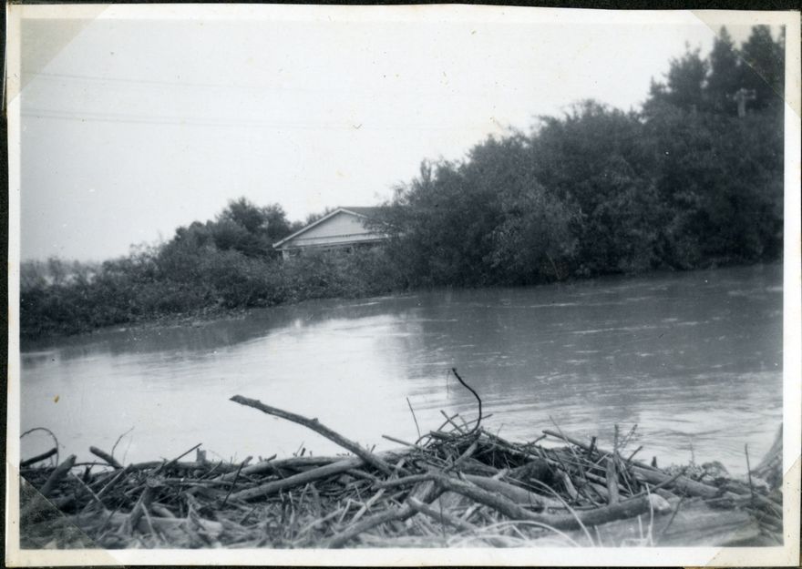 The 1953 flooding of the Manawatu and Oroua River was one of the worst on record for the area. This photograph shows the debris left by the floodwaters. An eyewitness said local boys made makeshift rafts from the branches.