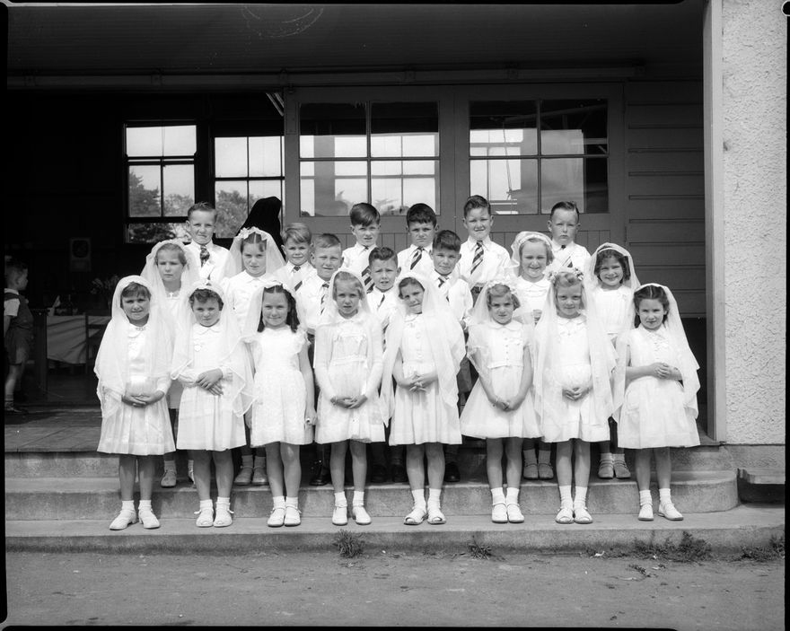 A group of children making their First Holy Communion, photographed outside Our Lady of Lourdes Catholic Church in Shamrock Street.