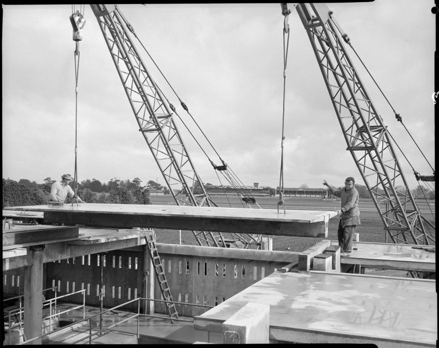 The sewerage treatment plant beside the Manawatu River opened in 1968, replacing the septic tank and filter beds which had been in use since 1905. Some images from this collection have been digitised from prints housed in other archival collections. This image is from an original negative.