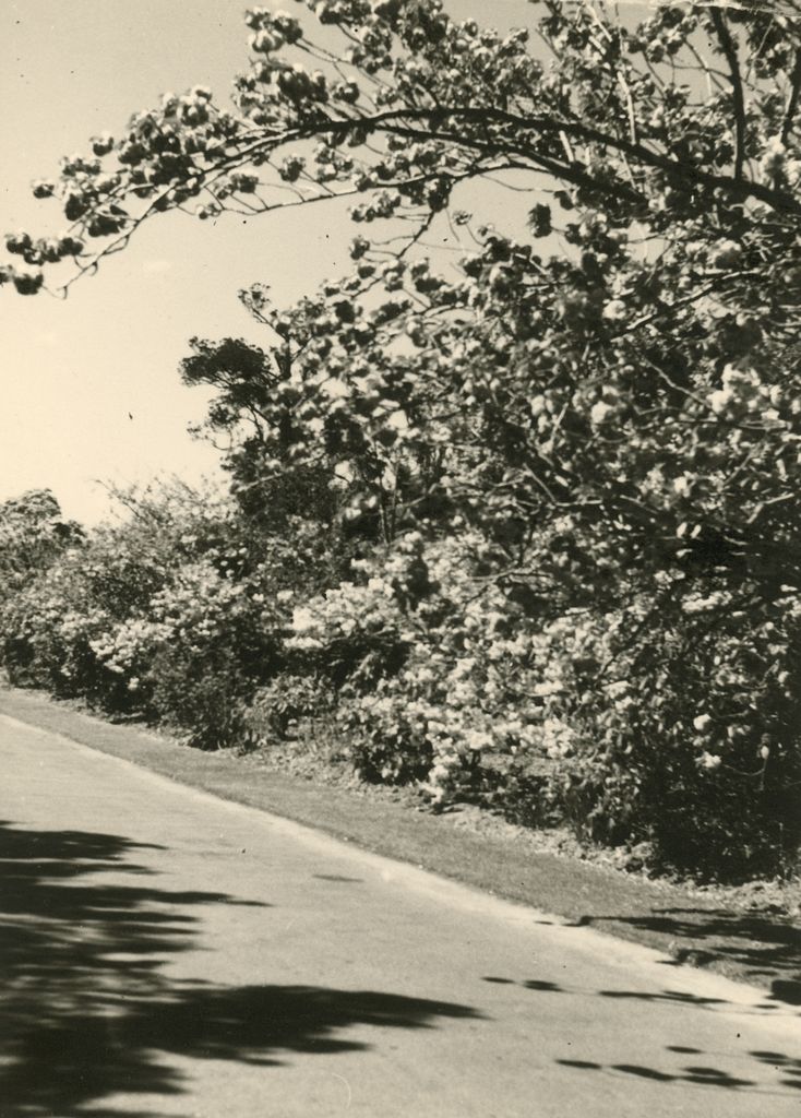 A view of what appears to be cherry trees lining one of the roads that runs through the Victoria Esplanade.