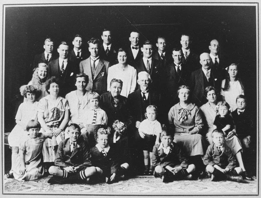 Jens Christensen (1848-1928) and his wife Catherine arrived in New Zealand from Denmark in 1876. They lived at Turitea from 1882, before settling on a 25 acre farm in Fitzherbert East in 1886 with their five children. Another son was born in the area. This photograph was probably taken on the occasion of their Golden Wedding Anniversary.