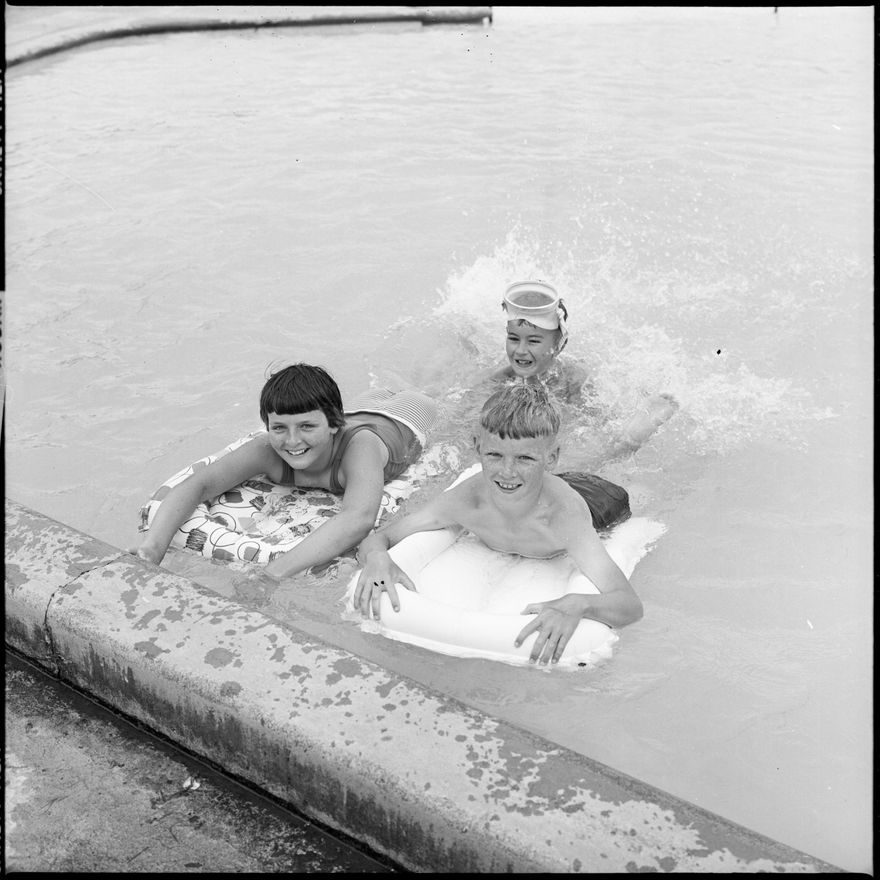 This image was taken (but not used) for a story that ran in The Manawatu Evening Standard on 8th January 1966 "Enjoying a cool dip at the memorial Park pool today are Heather, aged 12, and Brian Hicton, aged nine. In the background is Trevor Connolly."