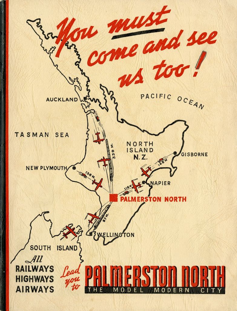 A promotional booklet, produced by the Palmerston North City Council. The cover reads, "You Must Come and See Us Too!". Contents include photographs and information about: The Square, the Lakelet, municipal buildings, the Esplanade, the Fitzherbert Bridge, Botanical Gardens, City Library, City Reserves (parks), abbatoir, Awapuni Racecourse, the Fire Station, Bus Service, sport facilities, Ladies Rest building (toilets), Chief Post Office, Railways and State buildings, the Police Station, schools, streets, All Saints Children's Home, Willard Children's Home, Plunket Society Rooms, Women's Division Farmers' Union Rest Home, Churchs and other ecclesiastical buildings, industrial buildings, Palmerston North Hospital, Milson Aerodrome and more. Original publication found in PNCC Archives 1/17/5