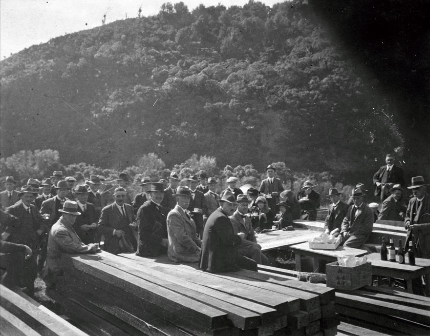 Shown here is a function conducted by the Manawatu Board of Control regarding the widening and straightening of the Manawatu Gorge. Mr J.A. Nash is speaking and immediately in front of him is Hon. J.G. Coates, Minister of Public Works.
