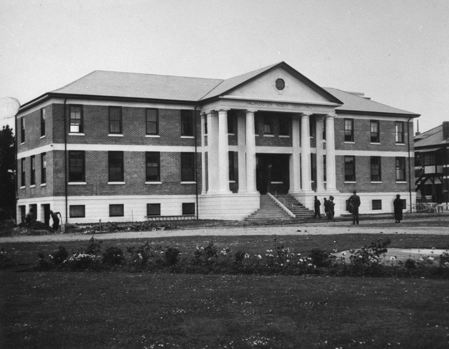 This brick Adminstration Building of the Palmerston North Hospital was erected in 1936. It was the main entrance to the hospital off Hertaunga Street. The building remains within the hopital complex but is no longer the main entrance, which is off Ruahine Street.
