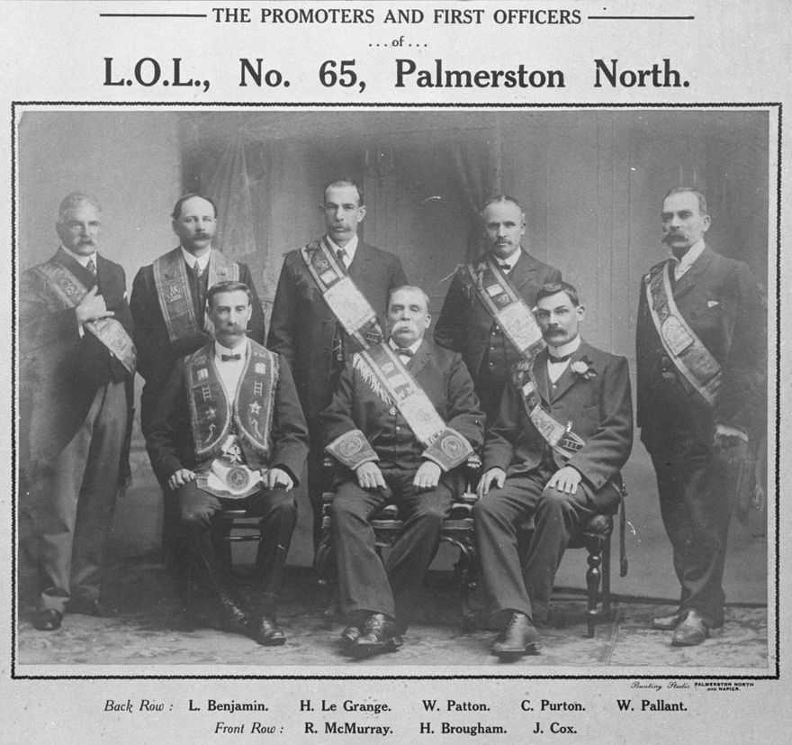 The Loyal Orange Lodge is a Protestant fraternal organisation that began in Northern Ireland. Since 1978 the Loyal Orange Institution in New Zealand has been a registered charitable organisation helping many community and charity groups. 'The Promoters and first officers of Loyal Orange Lodge, Star of Freedom'. From left. Back Row: L Benjamin; H le Grange; W Patton; C. Purton; W. Pallant. Front Row: R. McMurray, H. Bougham; J Cox.