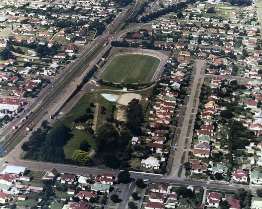 Memorial Park (previously named Fitzroy Park) at Terrace End, was formerly a metal pit used by the Railways Department 1876-1937 for ballast. The Palmerston North City Council purchased the 21 acre site in 1938 and developed it into a recreational and sporting area. A WWII memorial was erected 1952 and in 1954 Fitzroy Park was officially dedicated as Memorial Park. Note the railway lines running to the left of the park, from when the line ran out of the city via Main Street, before the Milson deviation took it to the outskirts.