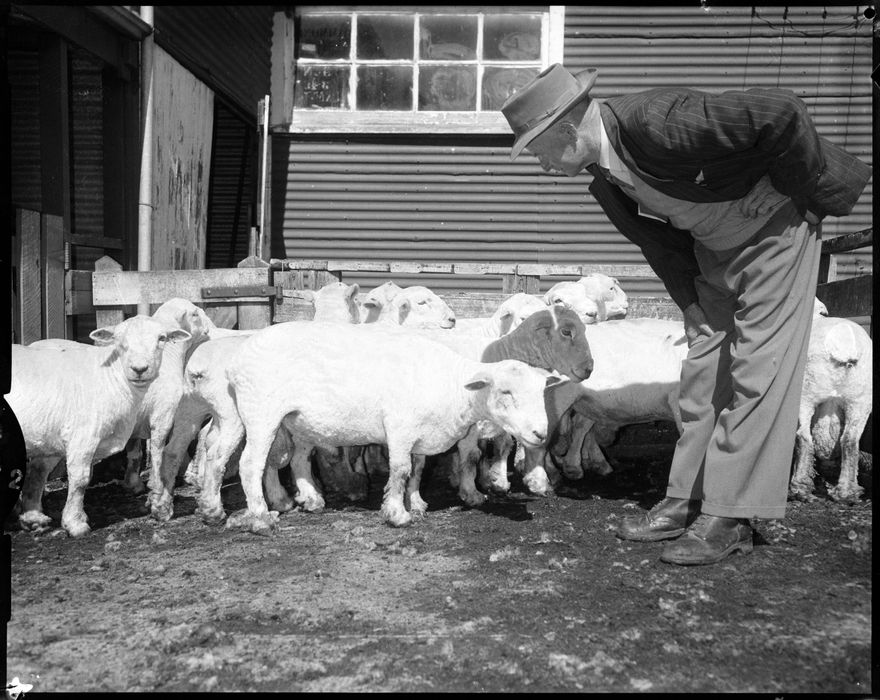 This image was taken for a story that ran in The Manawatu Evening Standard on 21 February 1961 "The farm manager of Flock House (Mr. A.E.T. Gallan) inspects a pen of newly-shorn flock rams. All the rams were shorn by the trainees."