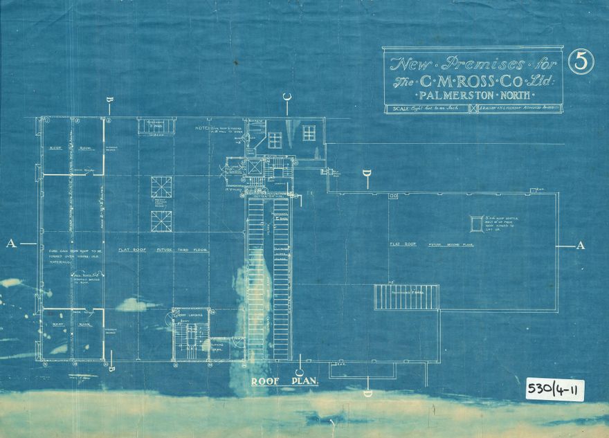 Roof Plan for the CM Ross Building. In 1927-1928 this new department store was built, replacing the three buildings that comprised C M Ross Co. Ltd on The Square, Palmerston North.