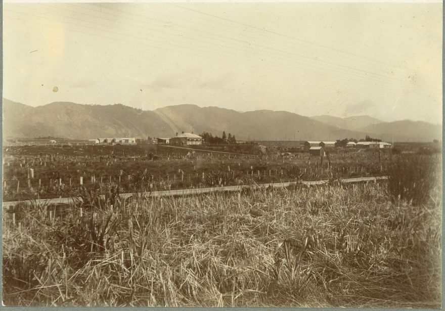 This view of the Miranui Mill buildings was taken from the Railway, looking south-east towards the Tararua Ranges. Scutching sheds are the white buildings in the left background. Stripping sheds in the middle background - hard to see clearly. Sleeping quarters, dining room on right background. The road in the foreground is the one between Shannon and Tokomaru.