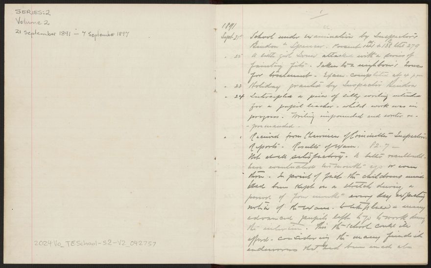 Terrace End School opened in 1884, with Mrs M. A. Harvey as the first headmistress. Subsequent head teachers included Mr von Blaremberg (1889 to 1893) and Mr T. F. Fairbrother (1893 to 1922). In addition to documenting the activities of the school, this log book also includes comments from the School Inspector.