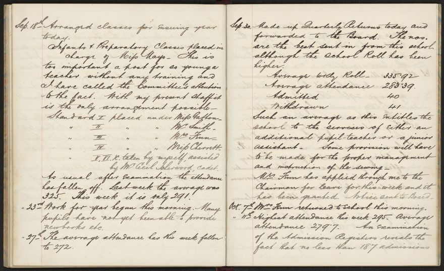 Terrace End School opened in 1884, with Mrs M. A. Harvey as the first headmistress. Subsequent head teachers included Mr von Blaremberg (1889 to 1893) and Mr T. F. Fairbrother (1893 to 1922). In addition to documenting the activities of the school, this log book also includes comments from the School Inspector.