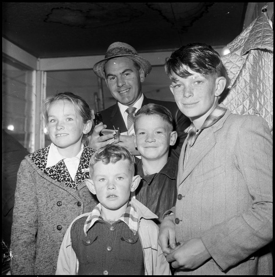 This image was taken for a story that ran in The Manawatu Evening Standard on 12 May 1961 "The winners of the scavenger hunt at the Palmerston North Industries Fair yesterday looked pleased with their success. They are standing in the broadcasting box in front of the M.C. (Mr. John Maybury). They are (from the left): Barbara Fletcher, the winner; her young brother Graham who assisted her; Ross Brumby, who gained second place; and the third contender, Ken Eagle."