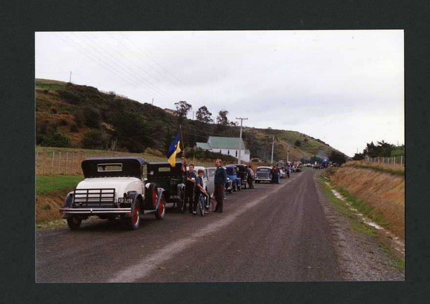 Vintage cars and floats line up as part of a parade celebrating the centenary of Aokautere School. The man and two boys with the blue and yellow flag are dressed in scouting uniforms. Aokautere School (formerly known as Fitzherbert East School) was established in 1889.
