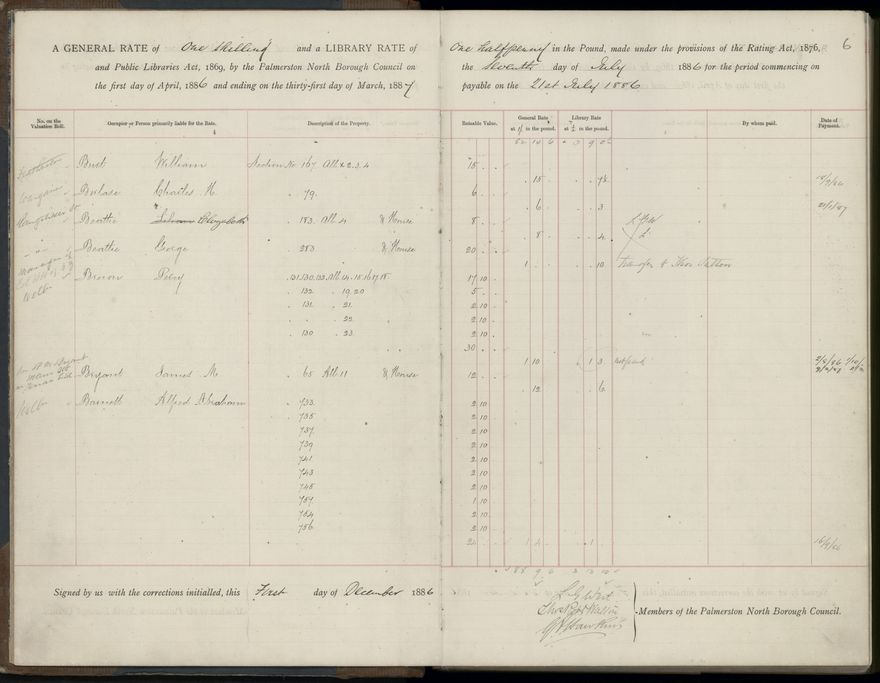 Rate book for ratepayers of PNBC, for the years 1886 - 1887, 1887 - 1888 and 1888 - 1889. Handwritten. Information includes occupier, address, owner (if different), description of the property and rating values.