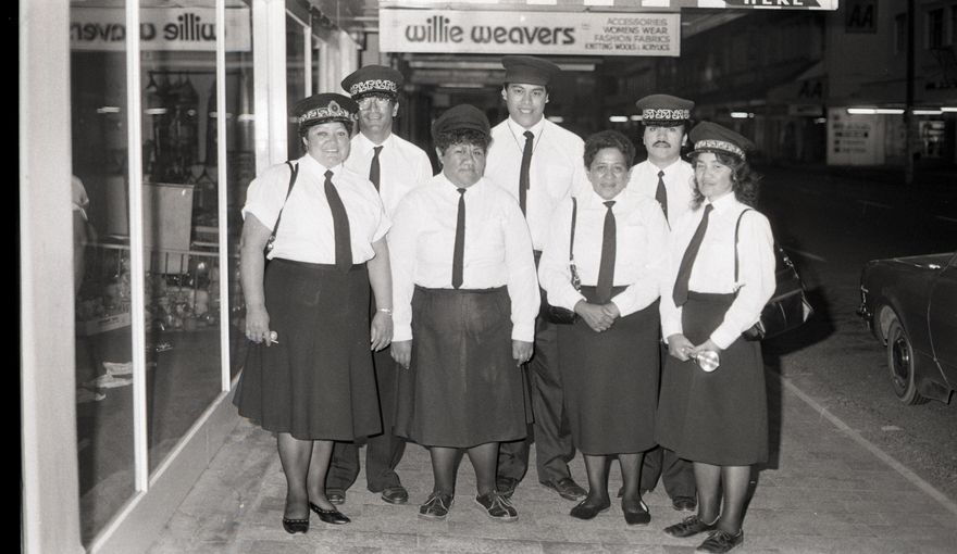 Identified are: Carol Hall (front row, far left), Jim Puki (back row, middle) and George Rerekura (back row, far right). This image was taken as part a feature that ran in the Manawatu Evening Standard on January 17 1987 about the work of Māori Wardens in Marton. According to the story that accompanied the photographs, Māori Wardens were instituted in 1937 and by 1987 there were 2300 working voluntarily throughout in New Zealand under the jurisdiction of the Māori Wardens' Association. Before receiving their badges and warrants, trainee wardens underwent an 18 month probationary period, taking training from senior wardens and the district wardens' associations.