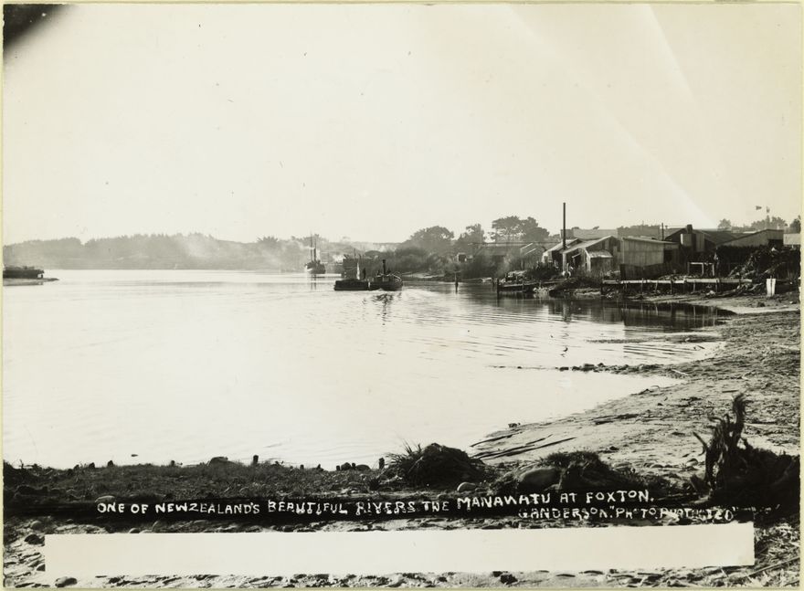 The three flaxmills are 1. Foxton Mill of A King & Co in right background with white water tank. 2. Star Mill, G Coley in right centre with tall smokestack. 3. Ora Mill, H Greig in right foreground with flax stacked in yard.