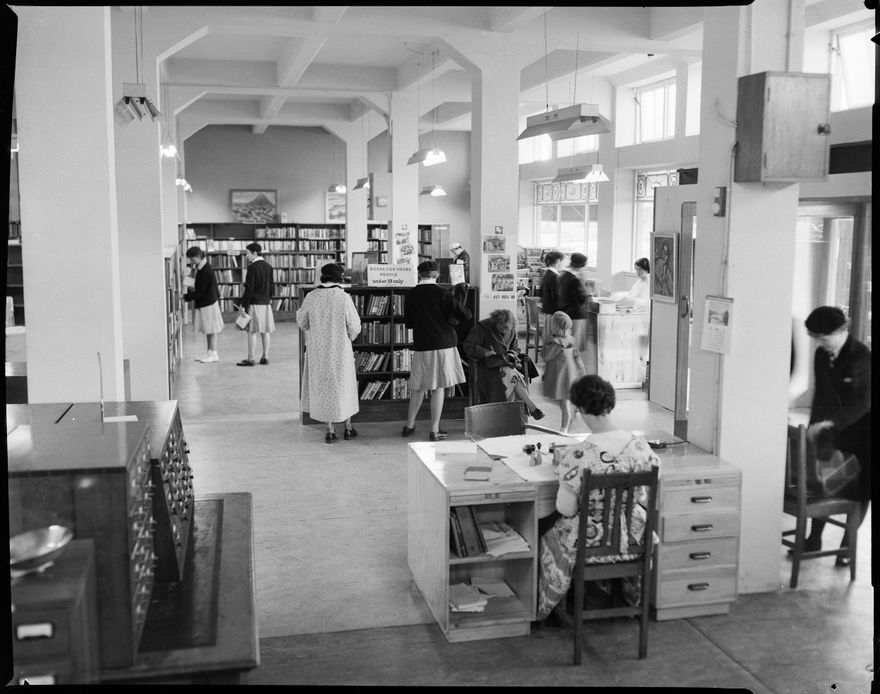 This image was taken for a story that ran in The Manawatu Evening Standard on 13 April, 1959. "Spaciousness and colour give the modern touch to the newly-reorganised free lending department of the Palmerston North Public Library. In the foreground of this photograph of portion of the downstairs rooms are the card-index cabinets and inquiry desk. At the far end of the room is the book rental department."