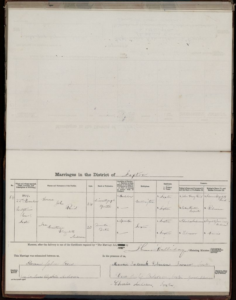 This marriage register was for the Foxton Presbyterian Church from 26 July 1909 to 25 November 1929. It includes registry of marriages outside Foxton and Certificates of Dissolution of Marriages where applicable.