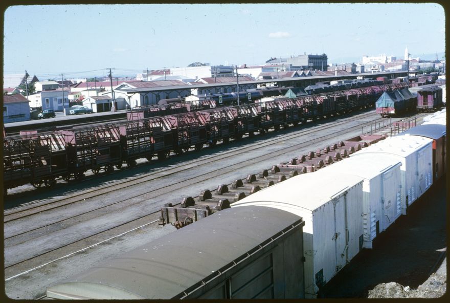 Railway yards in Main Street, Palmerston North, just prior to their closure when the lines were diverted to the edge of the city.