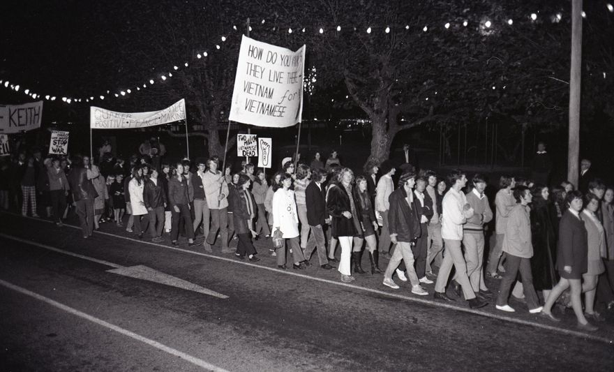The March was organised by the Palmerston North Anti-war Mobilisation Committee, including R. Lyall, Massey University Student Association President Gary Emms, and Unionist Alan Millar. The Nash Street Jug Band lead the singing and Hana Burke sang ‘a Maori song of parting’. Poetry was read by Mr. Lyall and Des Woods. The Reverend Loyal Gibson of the Trinity Methodist Church lead prayers after Churches across the city rang their bells in solidarity.