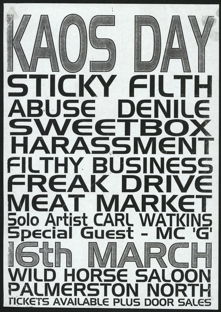 Kaos Day, Sticky Filth, Abuse Denile, Sweetbox, Harassment, Filthy Business, Freak Drive, Meat Market. Solo Artist Carl Watkins. Special Guest - MC 'G'. 16th March. Wild Horse Saloon Palmerston North. Tickets available plus door sales.