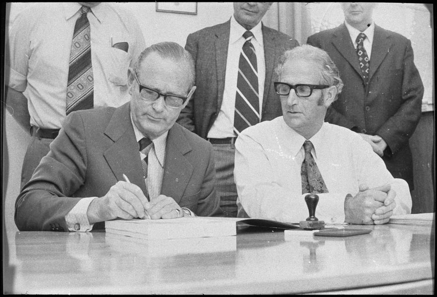 The new Cook Street Fire Station, to be built for $1.8 million, replaced the out grown premises in Cuba Street. The Chairman of the Palmerston North Fire Board, G R Kear (left) signed on behalf of the Board and T L Ferris, Hawke’s Bay area manager of Angus Construction, signed on behalf of the successful tender. The Board accepted the tender after plans were approved by the Fire Services Commission. The Station, on the corner of Main, Church and Cook Streets was opened in 1977.