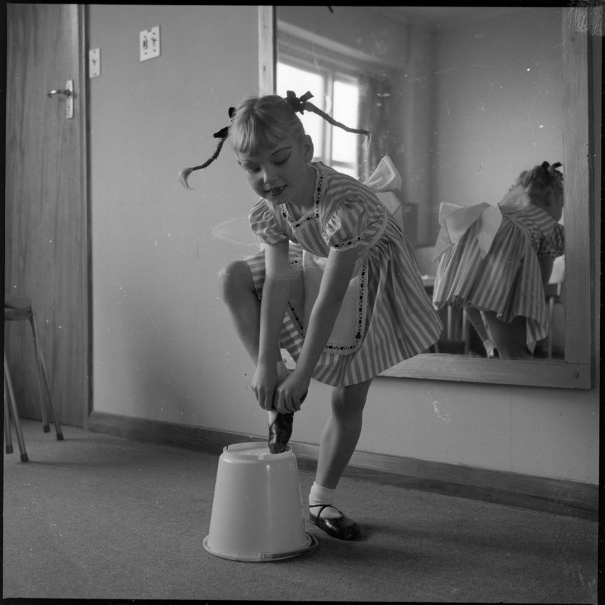 This image was not published in The Manawatu Evening Standard, taken on 6 July, 1963. "Wendy McMillan of Lower Hutt, ties her shoes before she takes her cue. Wendy was competing in the Palmerston North Thistle Caledonian Society's competition in which she won first place in the demi-character section for under eight-year-olds." Another image of Wendy was published on 6 July, 2019.